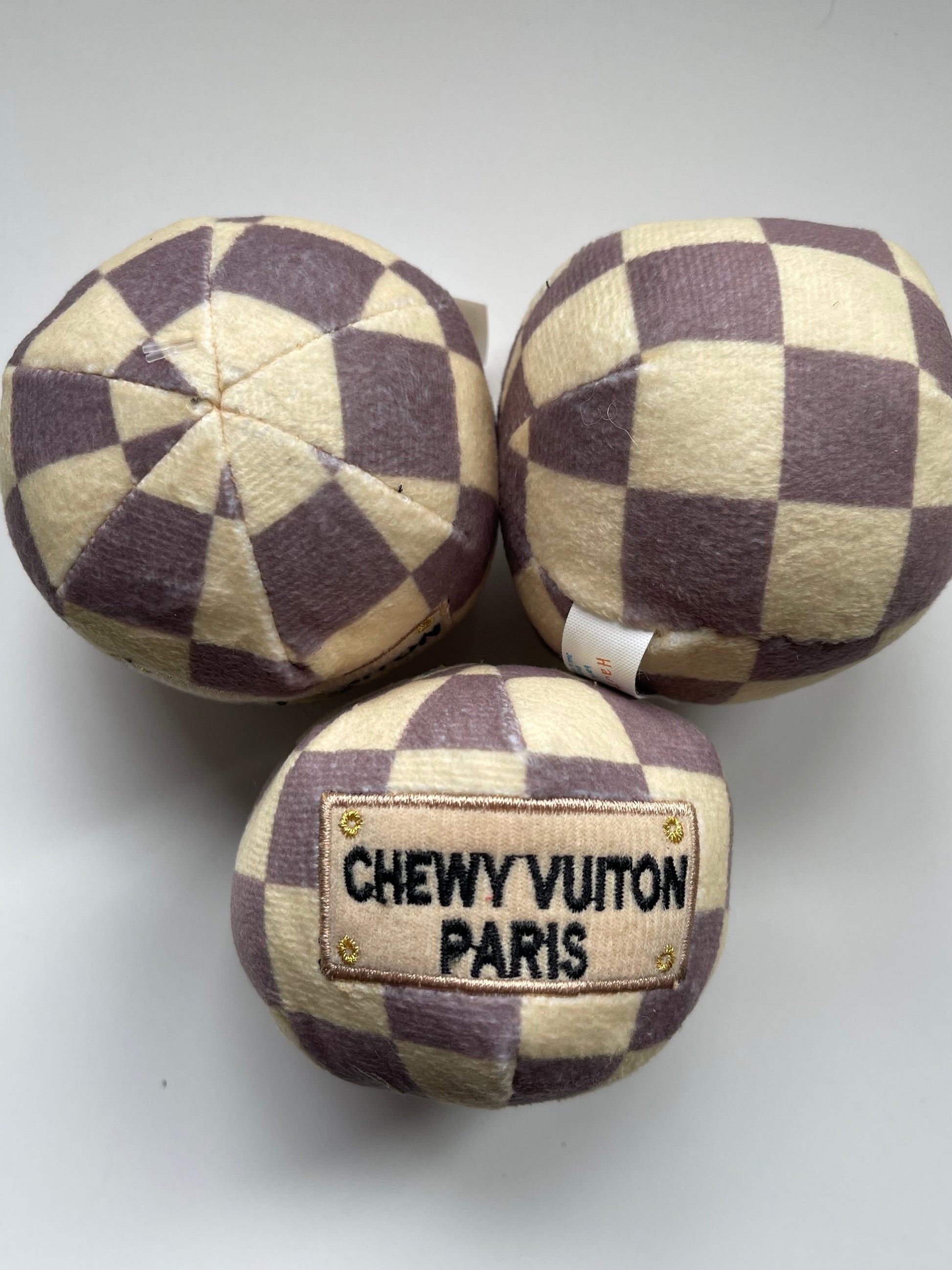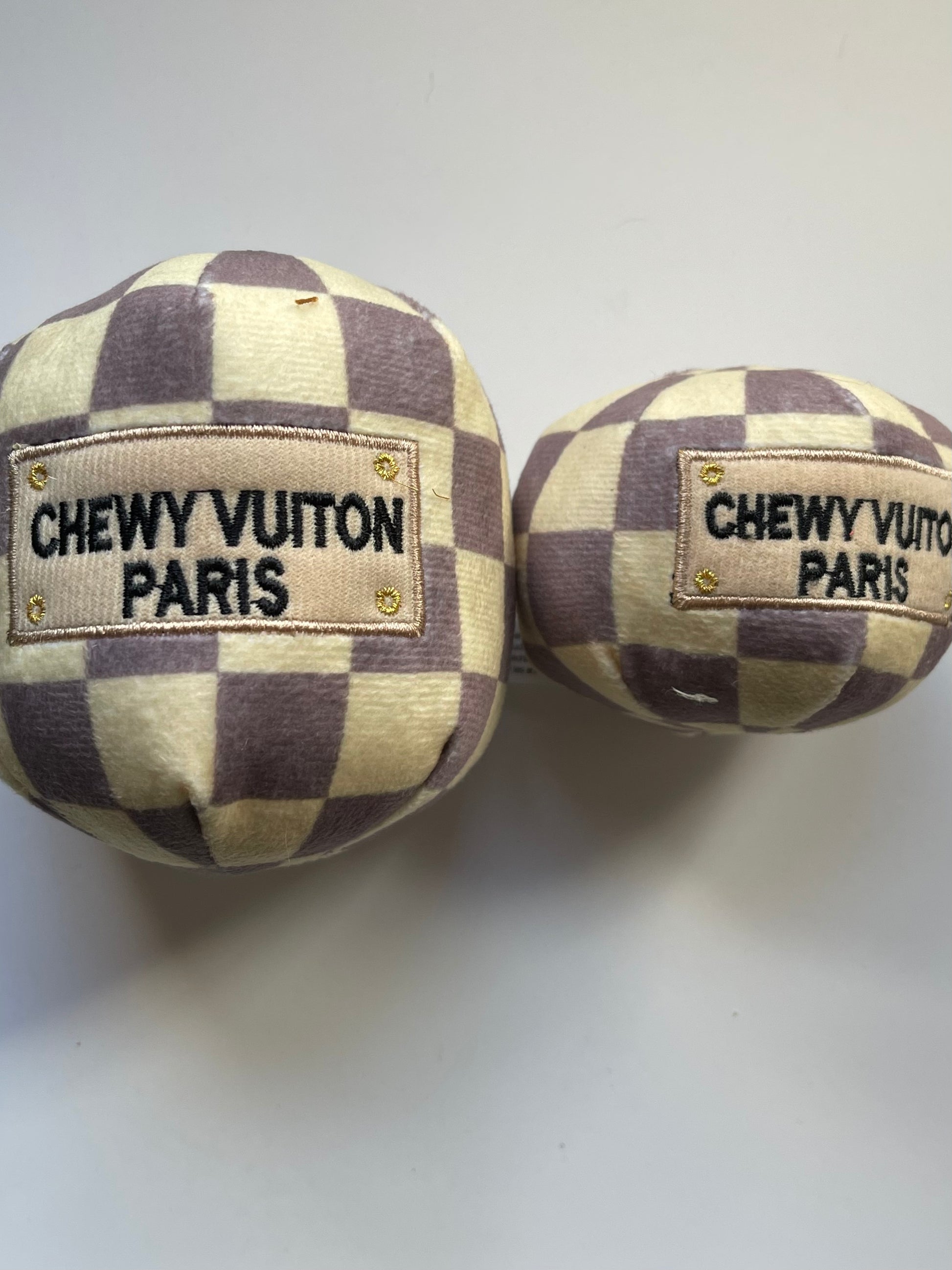 Beige and cream ball comes in either small (9 inch round) or large (12 inch round). Both sizes squeaks and fits your designer dog dribble.